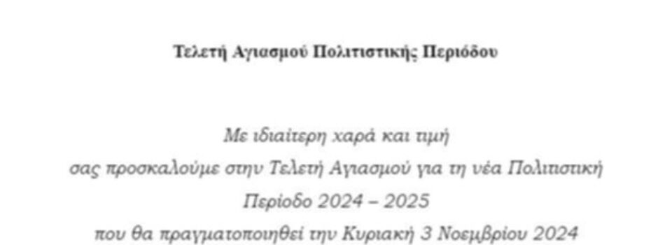 Με ιδιαίτερη Χαρά και τιμή σας προσκαλούμε στην Τελετή Αγιασμού για τη νέα Πολιτιστική Περίοδο 2024-2025 που θα πραγματοποιηθεί την Κυριακή 3 Νοεμβρίου 2024 και ώρα 11:30π.μ. στην Πολιτιστική μας Στέγη επί της οδού Νίκης 12